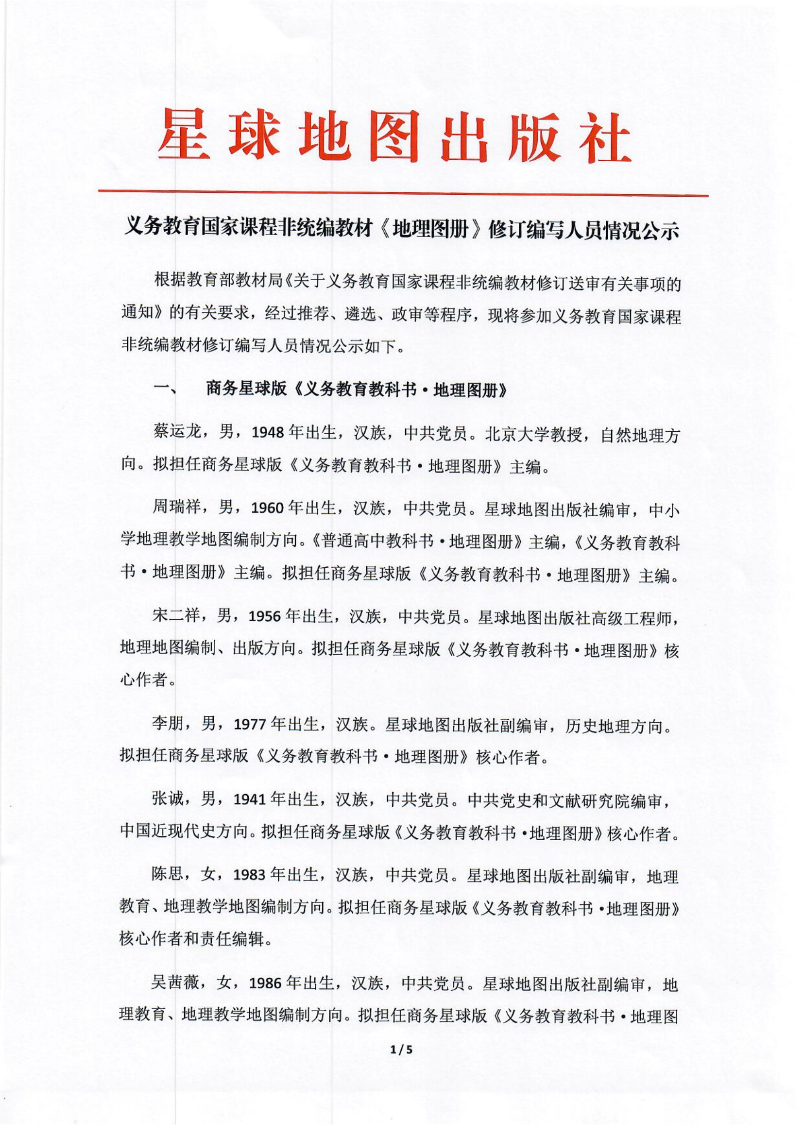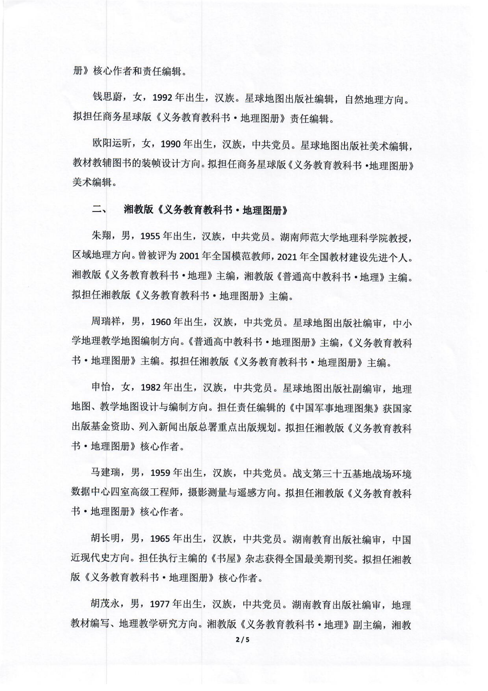 义务教育国家课程非统编教材《地理图册》修订编写人员情况公示