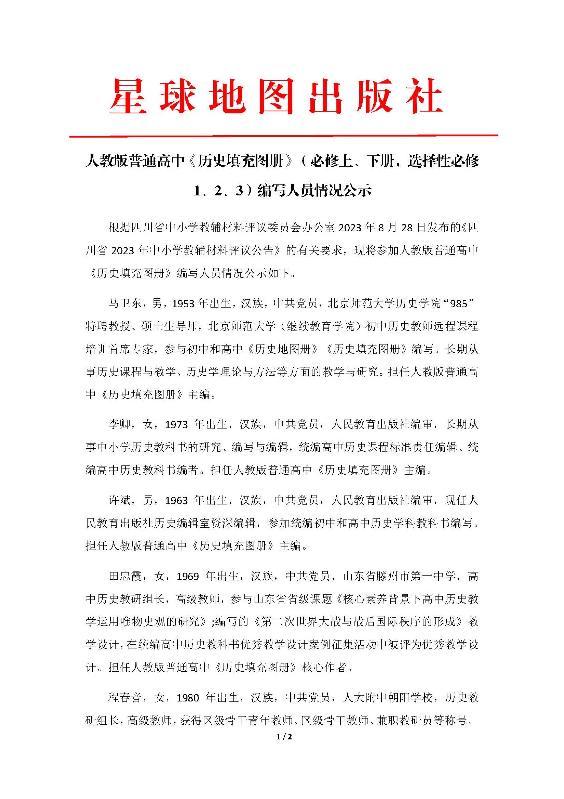 四川省2023年中小学教辅材料评议普通高中《历史填充图册》编写人员情况公示